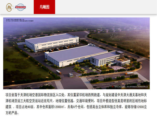 项目坐落于天津机场空港国际物流园区入口处,其位置紧邻机场西侧跑道,与规划建设中天津大通关基地和天津机场货运三大航空货运站近在咫尺,地理位置优越,交通环境便利,项目外檐造型优美是明显的区域性地标建筑 。项目占地40亩。其中仓库面积12000㎡,共有6个仓间,包括高台立体库和独立冷库,能够存储12000立方的产品。