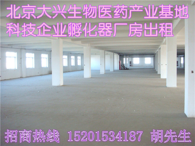 北京大兴南六环和京开高速的西南交汇处大兴生物医药产业基地内现有部分厂房对外出租。 工业园厂房占地35亩,一期建筑面积约3万平方米,现入驻高新企业企业20余家,目前还有7000平厂房对外出租。面积300、500、600、800、1200等任意分割。(1.2-1.8元/平米/天) 厂房框架结构楼房,层高4米或是5米,间距大好布局。 厂房手续全,可环评。 厂房适合做医药厂房、医疗器械厂房、新能源新材料厂房、实验室 、办公楼等。 孵化器内配有餐厅。 另现有4万平标准库房出租,适合做仓储 物流!(6毛/平米/天) 厂房周边交通便利,地铁4号线直达 厂房位置:大兴北藏村镇永兴路25号 孵化器直租,非中介,广告勿扰。 租金面议 联系人:胡先生 15201534187